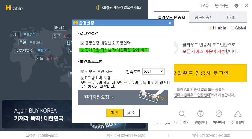 KB증권의 HTS는 프로그램이 정상적이지 않을 경우, 실행하는 화면에서 '전체파일 다시받기(최신파일 상세 비교)' 기능이 있어서 파일을 비교 후 이상이 있으면 다시 다운로드를 해서 정상적으로 변경해준다.