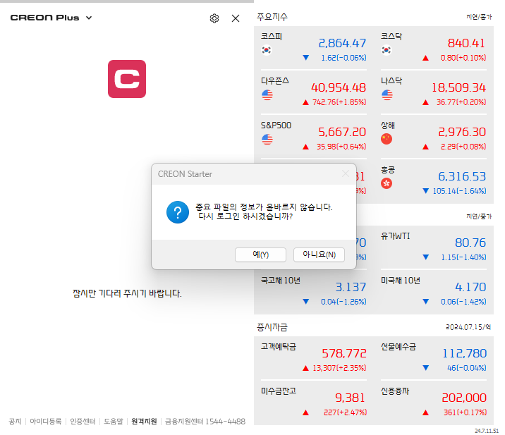 잘 사용하던 대신증권의 크레온 플러스(CREON Plus)가 업데이트 이후 '중요 파일의 정보가 올바르지 않습니다. 다시 로그인 하시겠습니까?'라는 메시지를 띄우며 로그인이 되지 않았다.