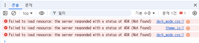 F12를 눌러 개발자도구(DevTools)를 열어 확인해 보니 'dark_mode.css, theme.js' 두 파일이 없다고 나온다.