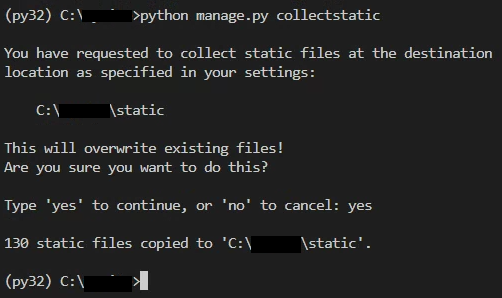 내 생각이 맞는지 확인해 보기 위해 static 폴더에 있는 admin 폴더를 삭제 후(혹시 모르니 복사본을 만들어놓은 후 진행하자) 터미널에서 아래와 같이 입력했다.