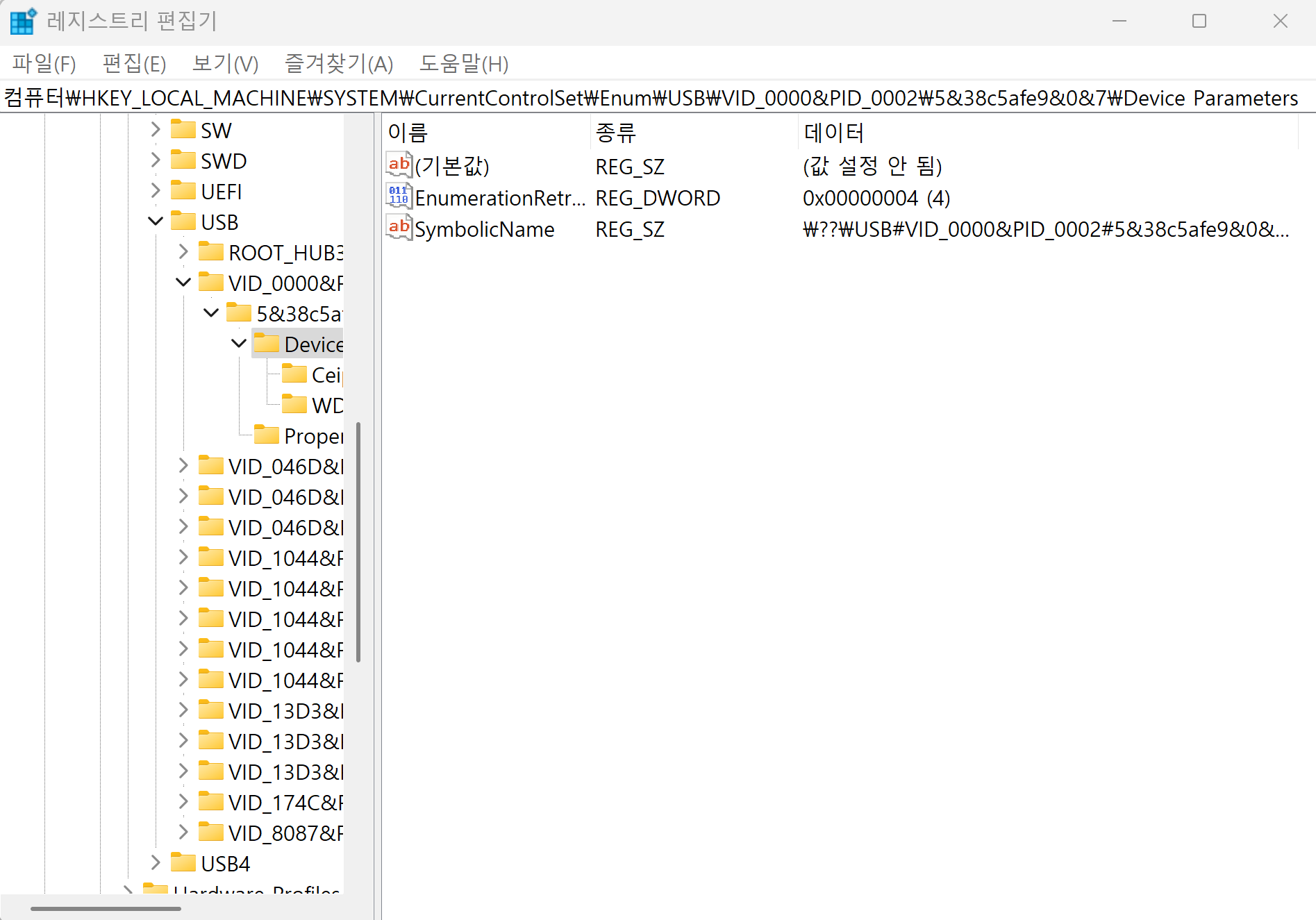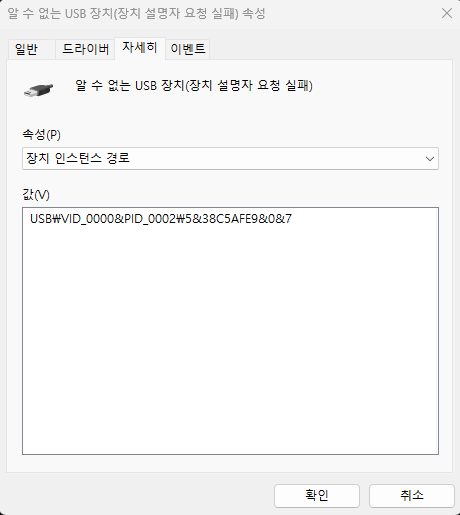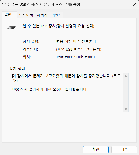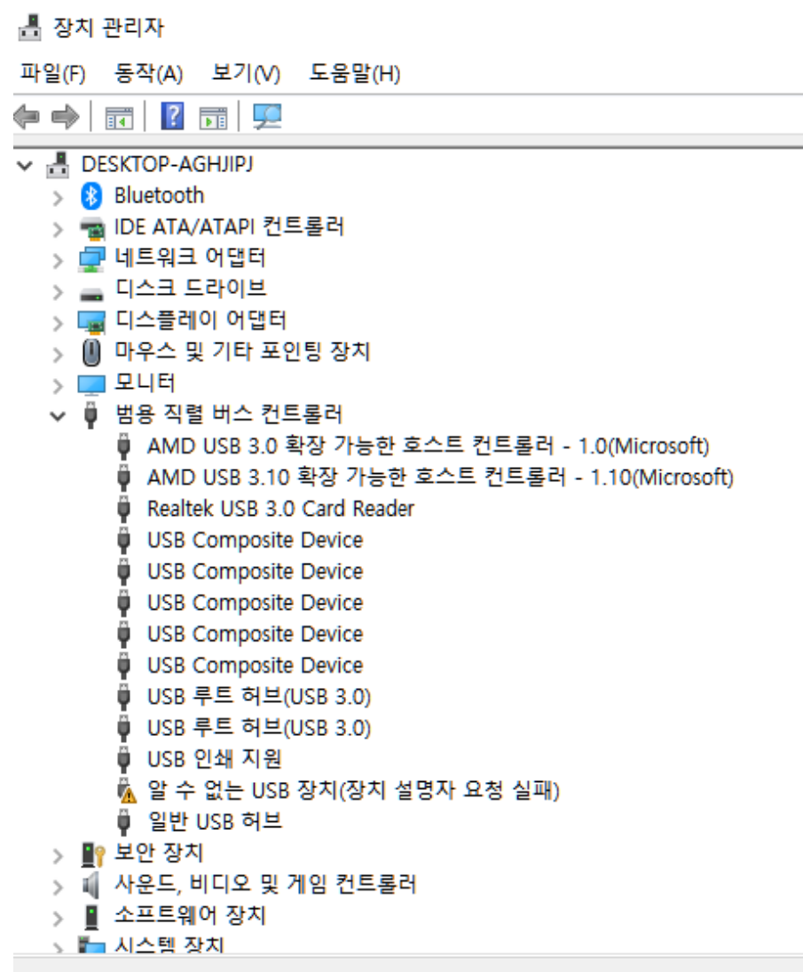 바로 장치 관리자에 들어가 보니 '알 수 없는 USB 장치(장치 설명자 요청 실패)'라는 것이 표시되어 있었다. 간혈적으로 정상 작동할 때는 볼 수 없던 오류라 바로 이것이 문제였다는 것을 생각할 수 있었다.