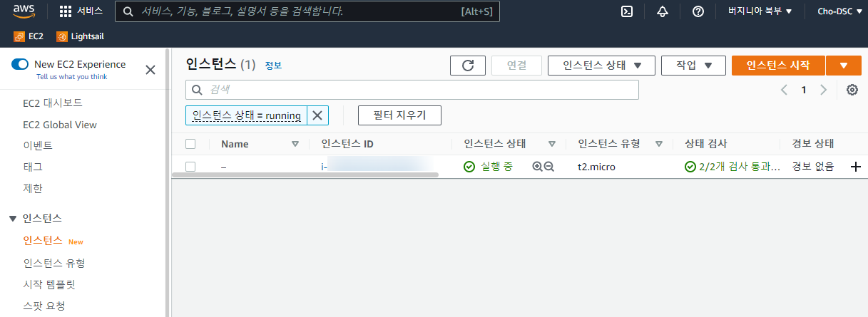완료가 되면 '인스턴스 상태'에 실행 중이라고 표시가 나온다.