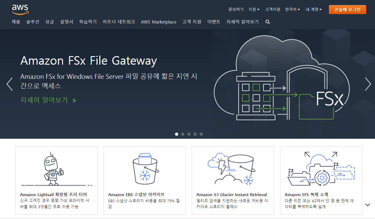 사이트 오른쪽 상단에 보면 '콘솔에 로그인'이 보인다. 클릭하여 아마존 전용 관리 페이지로 이동한다.