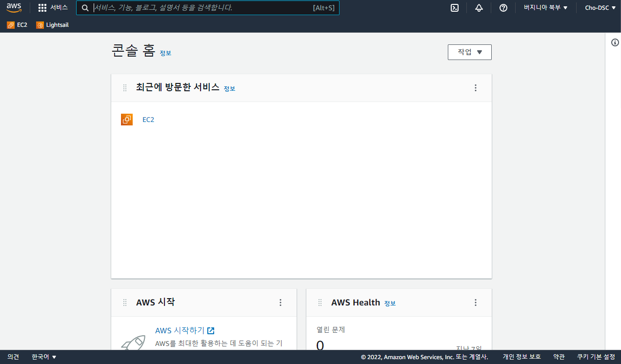 '콘솔 홈'이라 적힌 페이지로 이동하게 되는데, 상단의 검색창에 EC2를 검색해 들어간다.